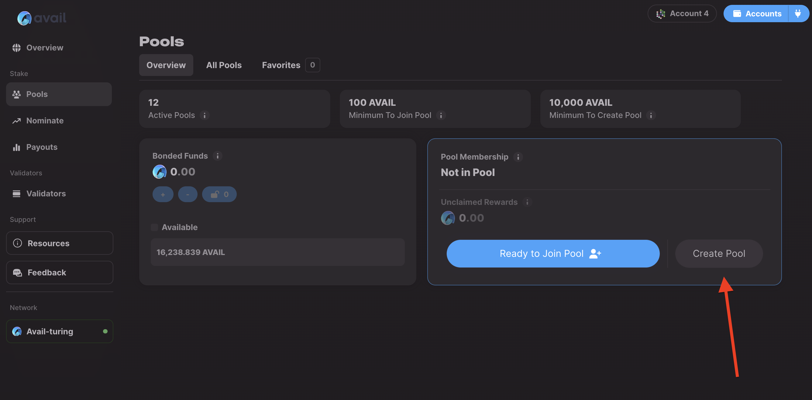 Go to staking.availproject.org/#/pools and make sure you have connected a wallet to the website that has sufficient funds to create a pool.